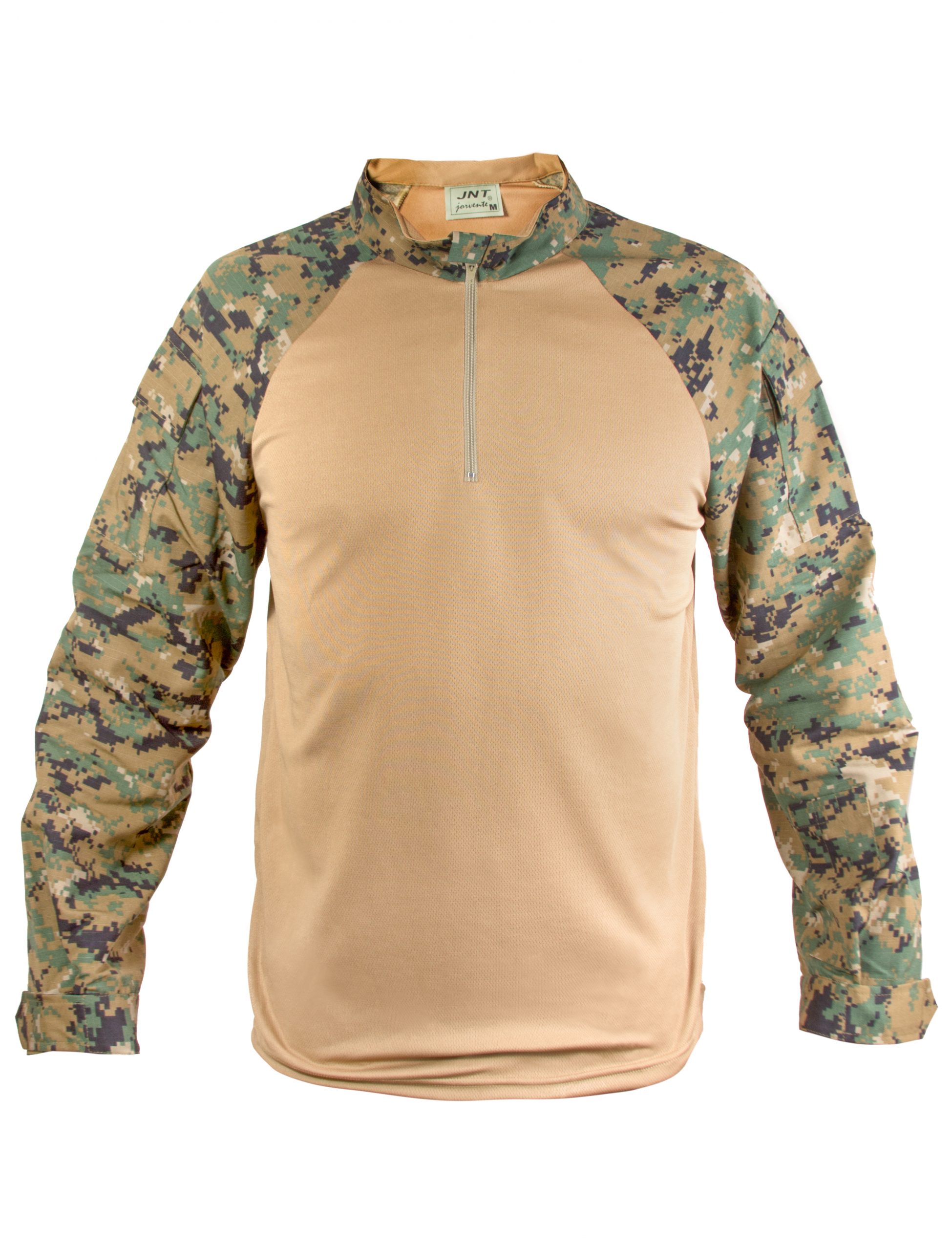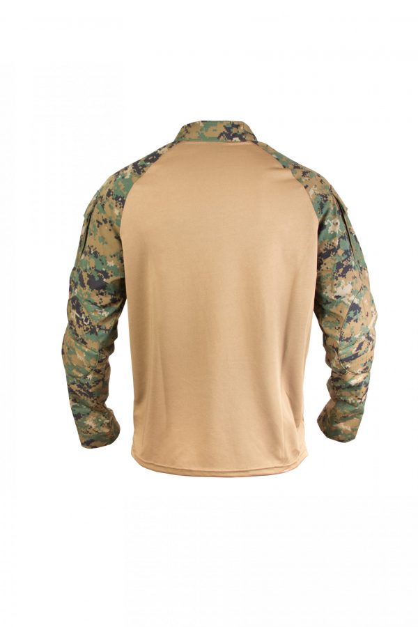 Polera de manga larga, con refuerzo de codos y bolsillos. Tenida de combate con mimetismo “Digital ZS” en los brazos. Tela hidrófuga con tratamiento anti hongos y filtros UV. Tela 100% Polyester. Este producto cumple con especificaciones militares.